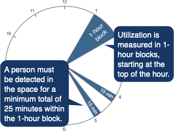 - For a desk or space to be considered occupied, people must be detected as present in the space for a minimum total of 25 minutes within a one-hour block. The 25 minutes do not have to be consecutive but must be within the same hour.