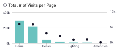 A combined chart displays the total number of visits to each page (bars) alongside the number of unique users making those visits (points).