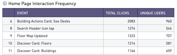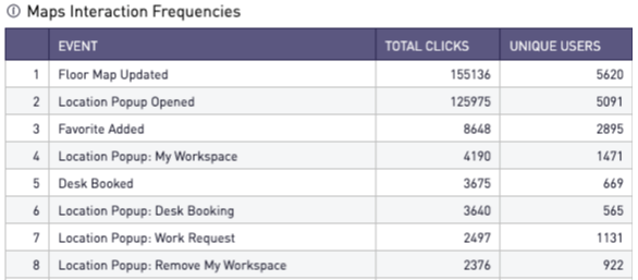 Table includes all the possible actions on the Maps page, broken out by total clicks and unique users. "Location Popup" refers to the popup that appears when a user clicks a point on the map.