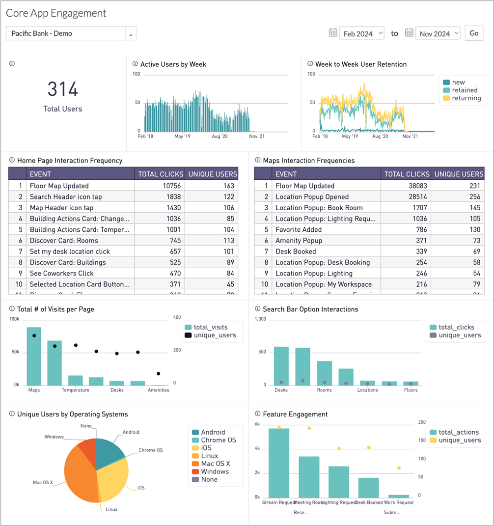 The Enlighted Connect Insights dashboard, Core App Engagement, provides visibility into how many employees are interacting with various parts of the Connect App. The dashboard displays statistics and information on changes over time, such as the number of users interacting with the app, the features they are clicking, and the frequency with which different homepage cards are clicked. This engagement data is available in monthly time periods (which you can adjust), with detailed data displayed in weekly and hourly intervals.