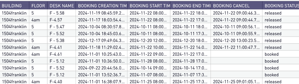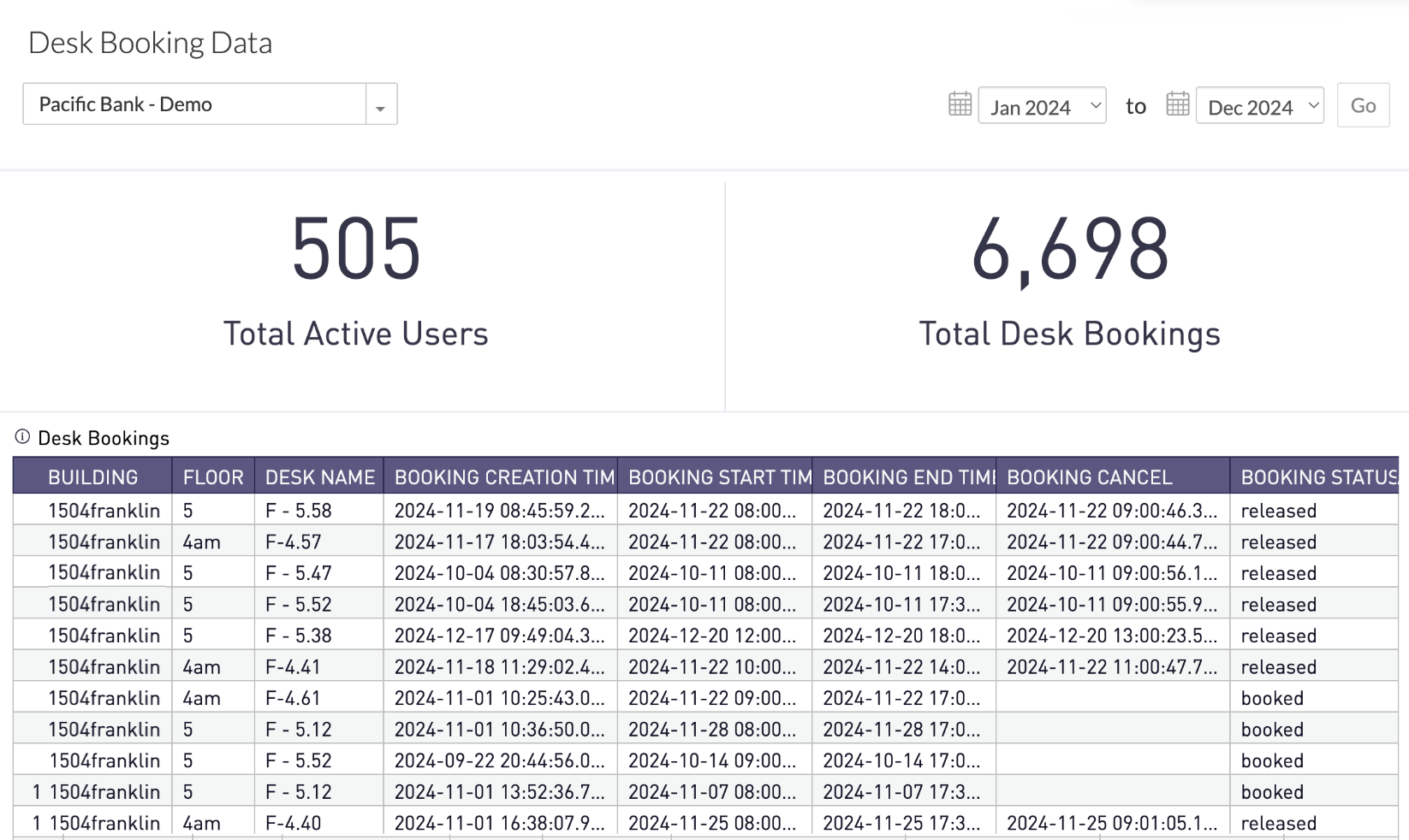 This dashboard provides filters to narrow the reporting data and date range. The data displays all distinct users, except for any bookings that were less than five minutes in duration.