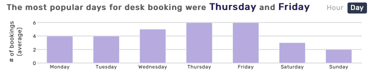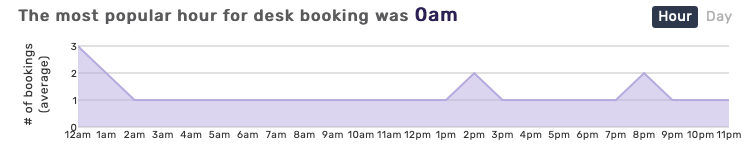Chart shows the hours or days most popular for desk bookings, within the parameters selected. You can hover over different areas on the charts to view booking details.