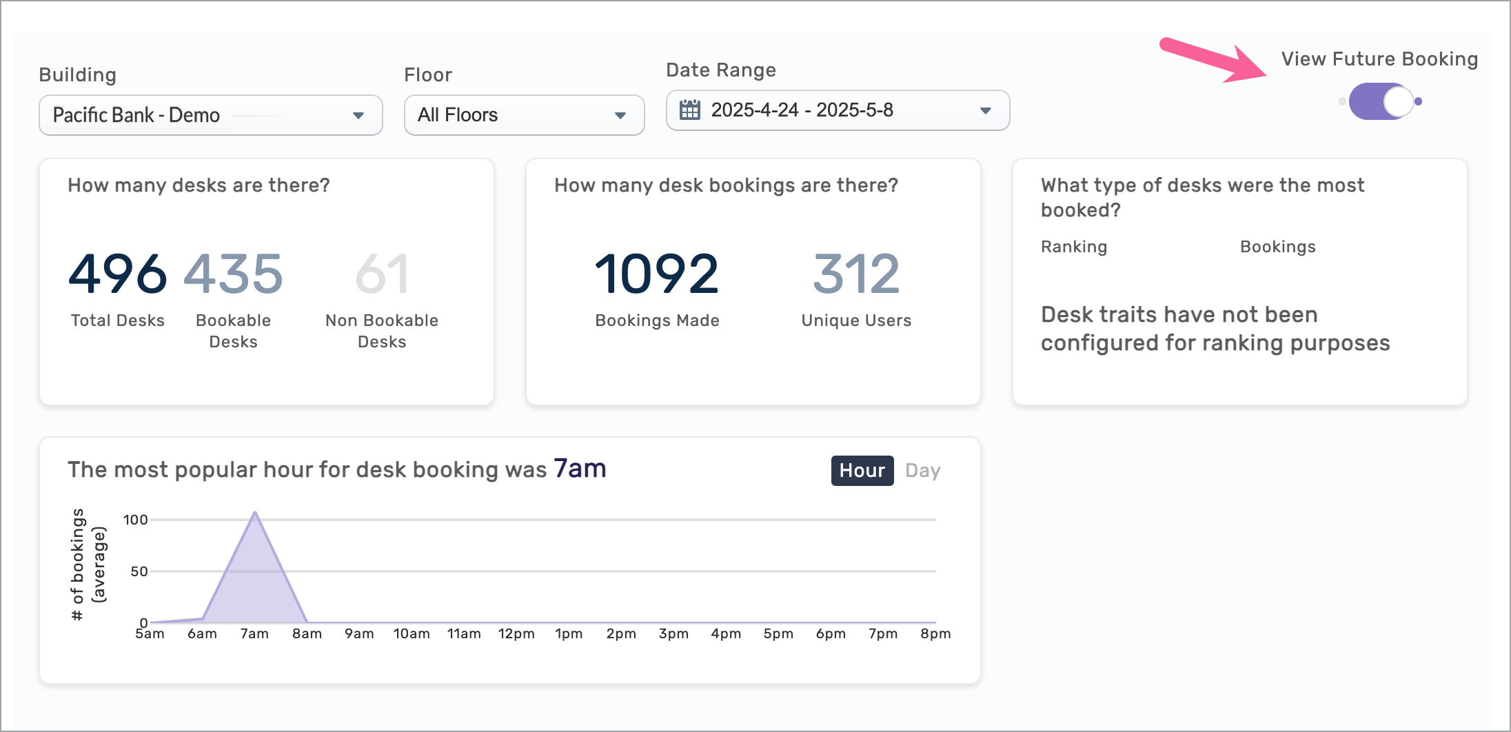 - Use the View Future Booking toggle to switch from historical desk booking data to a future range of days permitted by the building’s 'Advanced Booking Period'