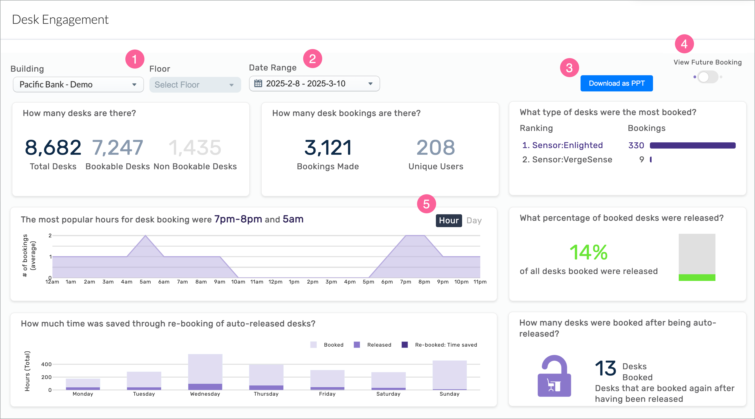 Use the Desk Engagement dashboard to see how employees interact with desks using the Connect App. The dashboard displays statistics and trends over time, including the aggregate number of desks booked, the most and least popular desk types, desk booking by hour, and auto-release metrics (if enabled).