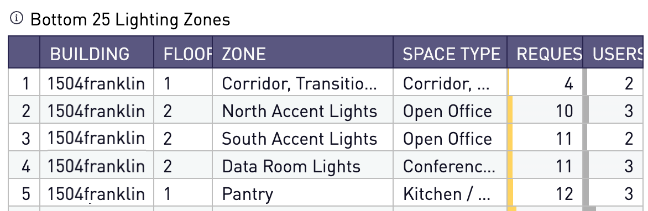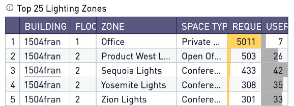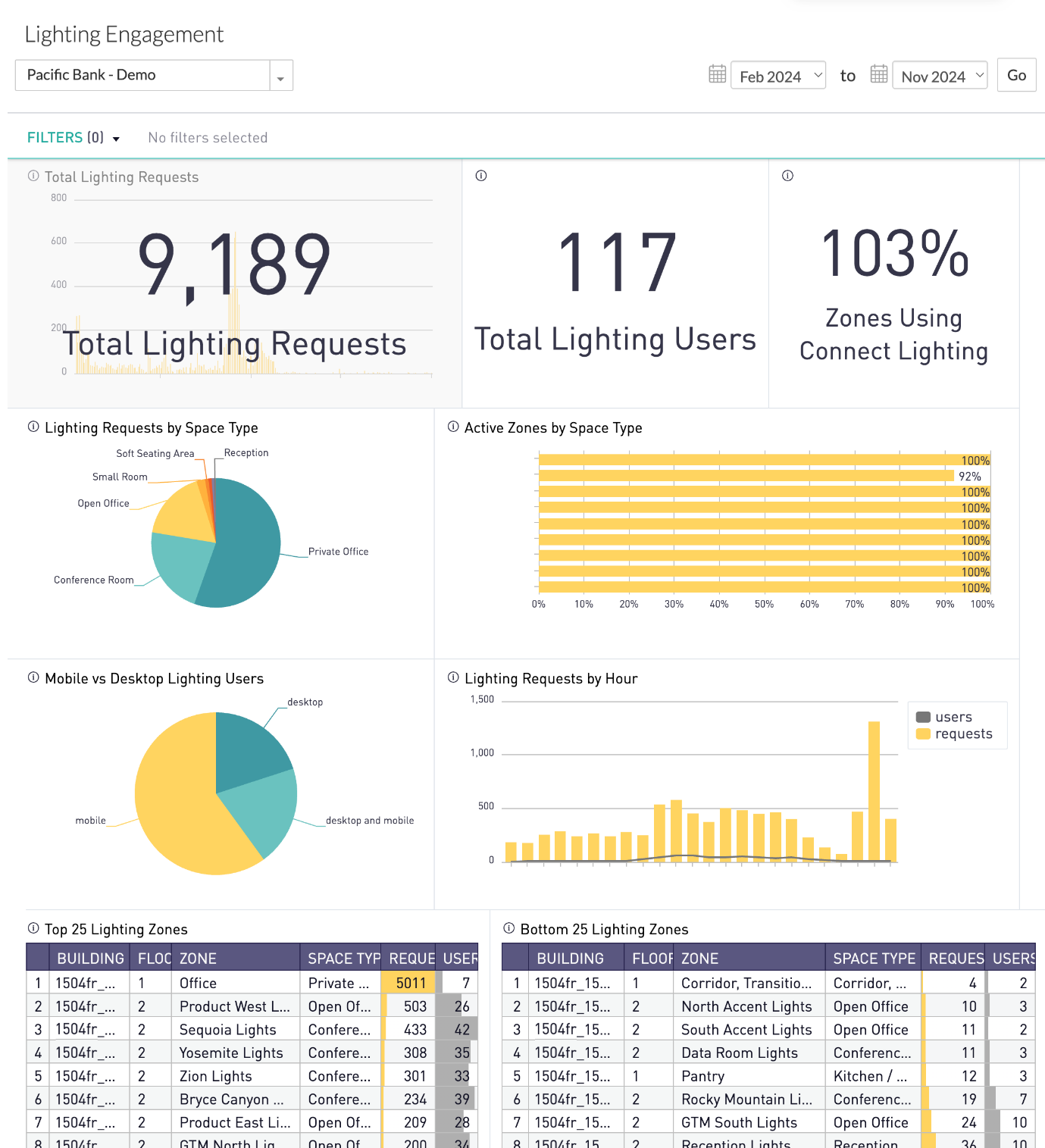 Administrators can use the Lighting Engagement dashboard to understand the level of employee engagement with the lighting control feature: