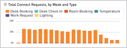 Shows cumulative total number of environmental adjustments or work requests made in the selected time frame. Possible request types include temperature, lighting, work requests, desk bookings, and/or room bookings.
