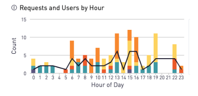 Combined bar chart counting the total requests per hour for the selected week. The user count indicates the number of distinct users, per hour, who made requests.