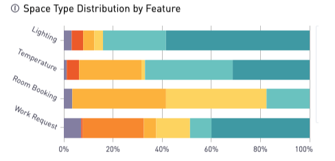 Stacked bar chart shows the distribution of space types by number of distinct requests for each feature. This chart does not include desk booking requests.
