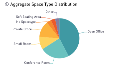 Pie chart shows what percent of requests were made from what space type. This chart does not include desk booking requests.
