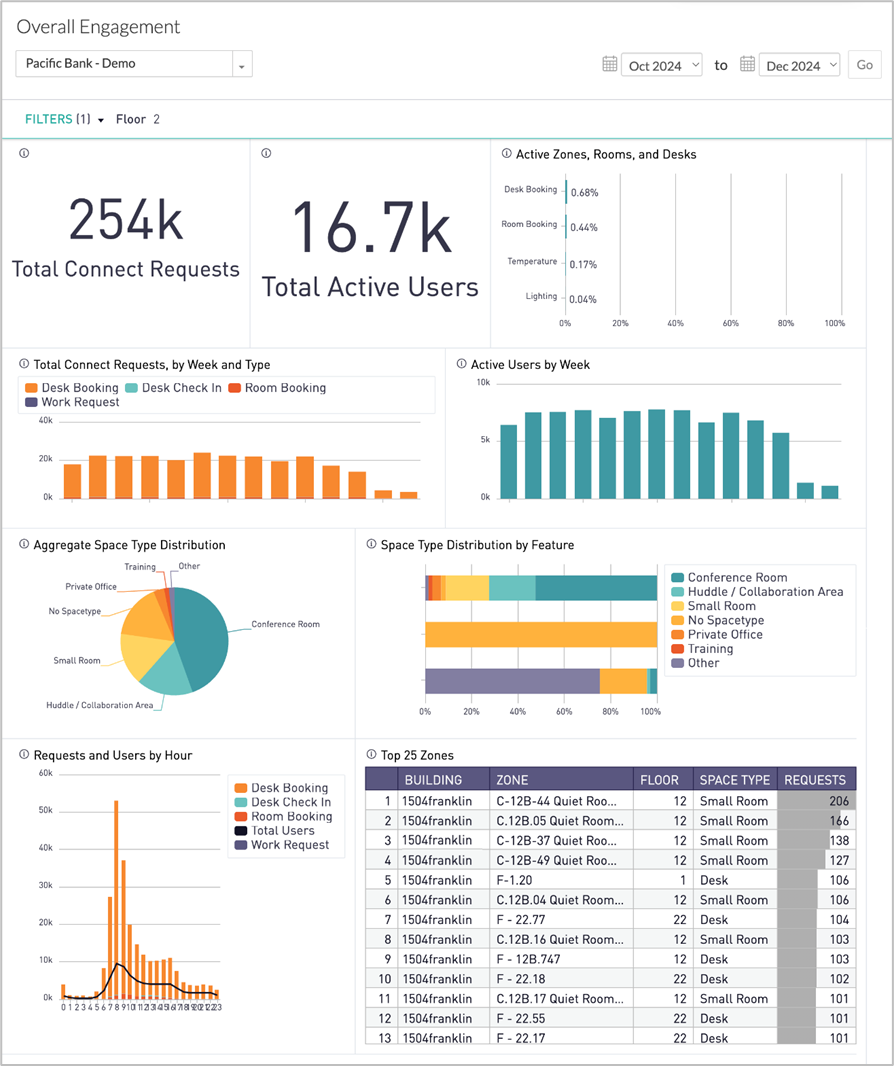 Use the Overall Engagement dashboard to learn about the environmental features users are controlling, the requests being made, and where these requests are being made. Data can reflect monthly time periods (which you can adjust), with details displayed in weekly and hourly intervals.