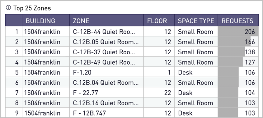 Table includes the twenty-five most popular bookable Zones, ranked by total number of booking requests.