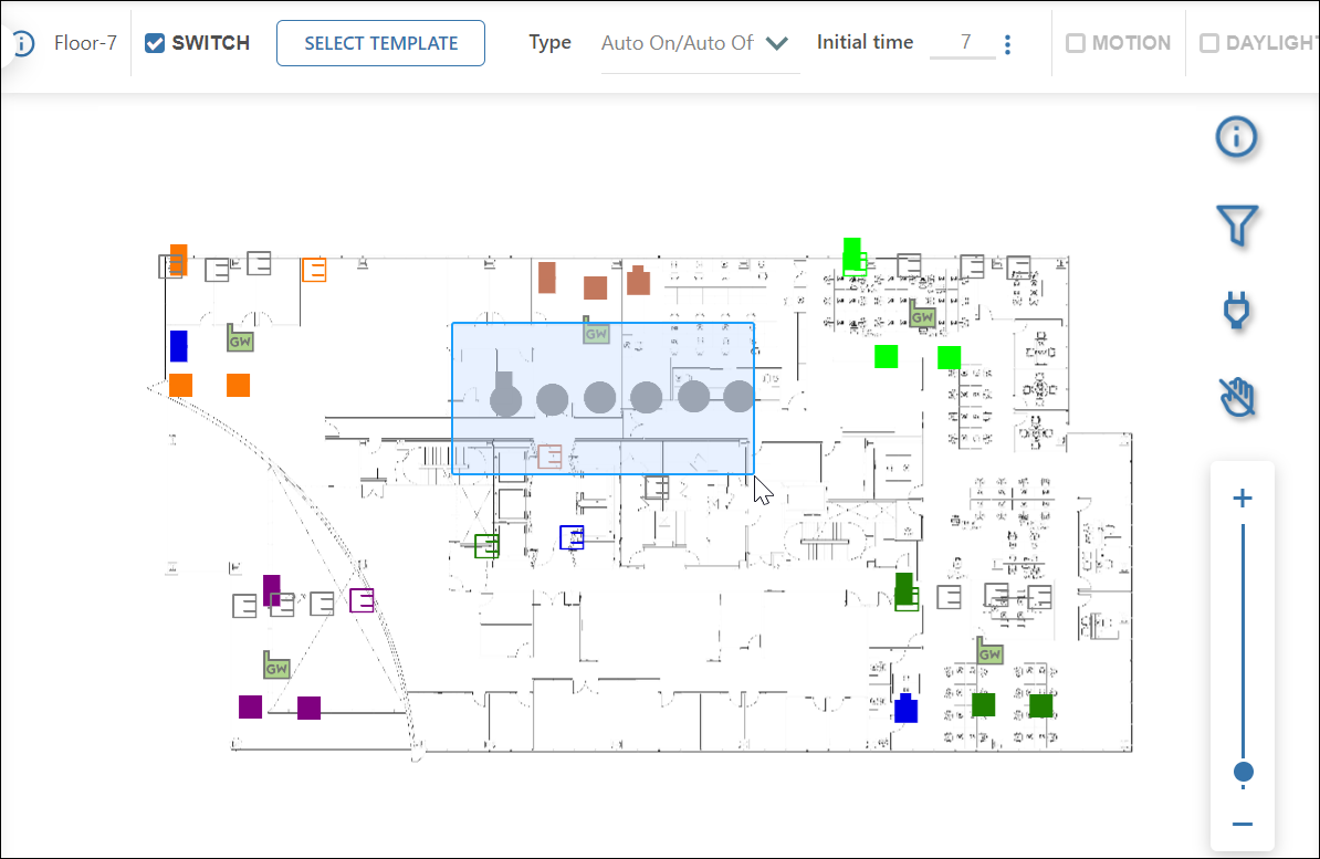 Hold the Ctrl key, click and lasso to select the devices on the floorplan that belong to different Gateways, or hold the Ctrl key and individually select the devices to be grouped. A single sensor can be associated with up to five groups. Select as many sensors as needed, as there is no maximum limit.