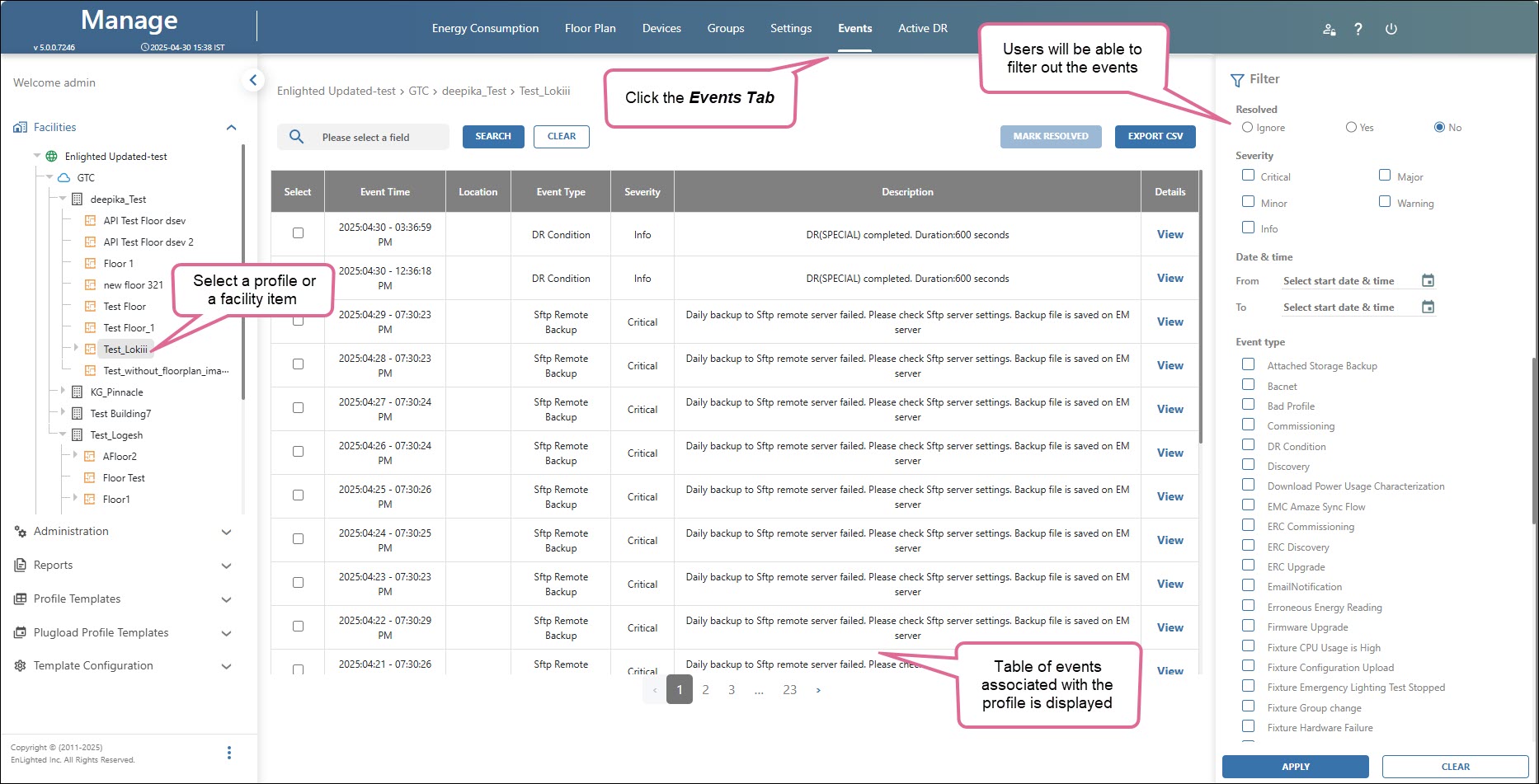 Clicking on a profile or a facility item and then clicking the Events tab. On the screen is a table of events associated with the profile or facility item. The screen also includes filtering and actions. The following is an example of the events screen: