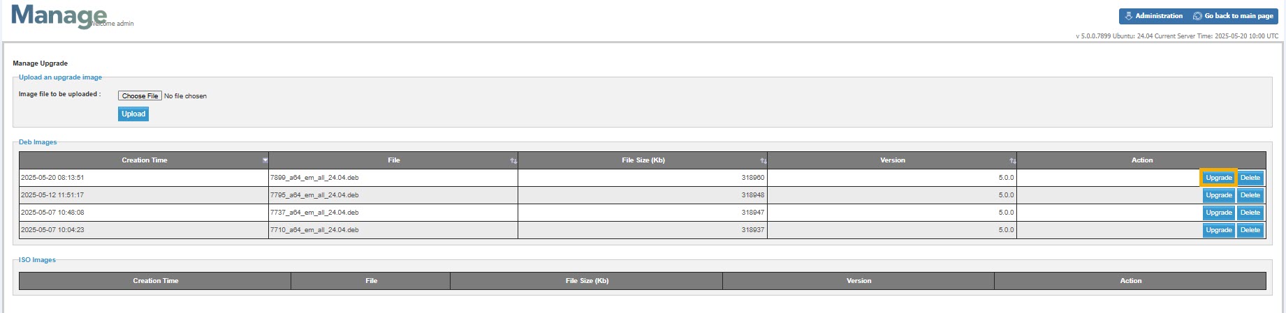 - To upload the image file to the server, click the Administration > EM Management menu item to see the server upgrade screen, which is available only to the user admin. This creates a new tab in your browser, and the following screen is displayed.