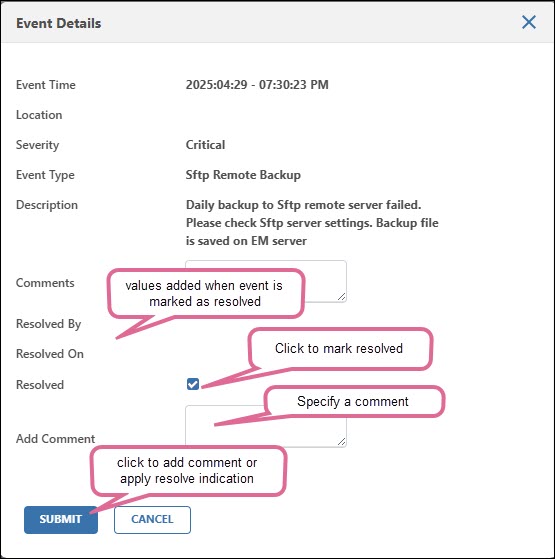 After you have resolved the issue, you should then mark the event as resolved in the GUI. To mark the events as resolved, select one or more events in the table, and then click on the Mark as Resolved button. This will result in a pop-up where you can enter a comment.