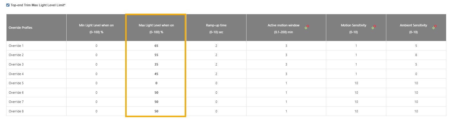 Caution: The values in the columns Override: 'Max. Light level when on (0-100%)' must be lower ( than the Period: 'Max. Light level when on (0-100%) value for the override to take effect.